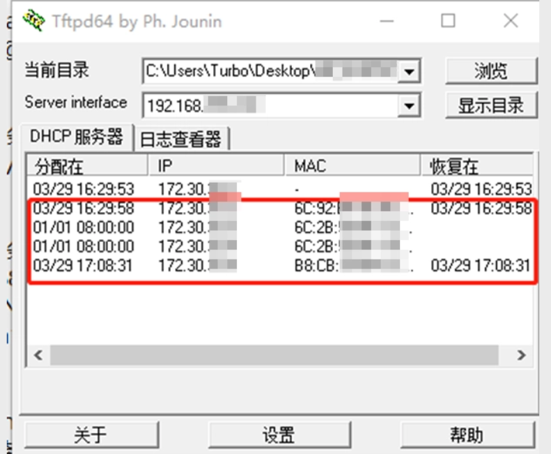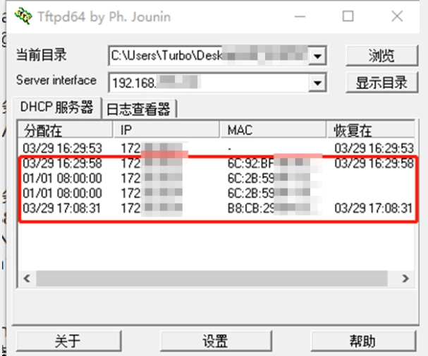这时我们需要使用一个有DHCP分配功能的小工具来给服务器iDRAC接口分配一个IP地址,本次测试我使用的工具名称是:tftpd64的小工具,打开工具设置好需要分配IP的地址范围后,可看到已分配给服务器的IP地址信息,如下图: