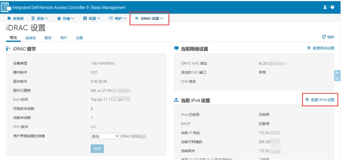 登录进去之后,直接选择iDRAC设置页面,找到配置IPV4设置,如下图: