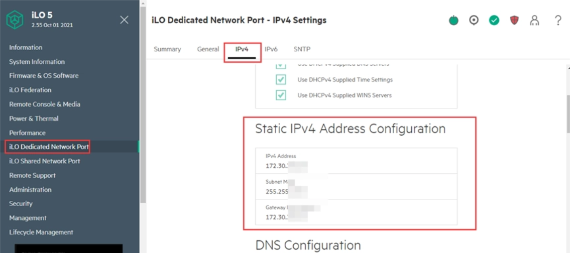 登录进入之后,在左侧菜单上找到iLO Dedicated Network Port进入设置界面,如下图: