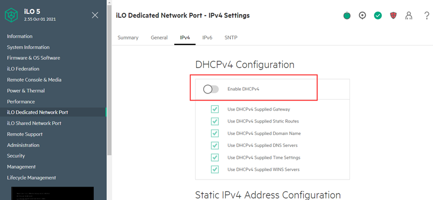 首先关闭接口的DHCP功能,防止后期管理接口接入用户网络之后,管理IP发生变化,然后再进行静态IP配置,如下图: