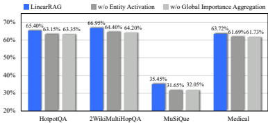 - 消融研究:通过系统性消融研究,验证了LinearRAG中每个组件的贡献。结果表明,相关实体激活和全局重要性聚合两个阶段均对最终性能有显著贡献。