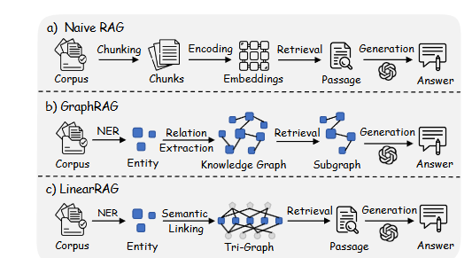 - 线性图构建:LinearRAG通过轻量级的实体提取和语义链接,构建一个无关系的层次图,称为Tri-Graph。该图避免了传统关系建模的不稳定性,并且与语料库大小线性相关,没有额外的token消耗。