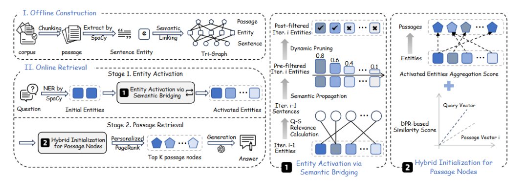 - 第一阶段:通过局部语义桥接进行相关实体激活:该阶段通过传播句子中的语义相似性,识别出超越字面匹配的上下文相关实体,挖掘多跳上下文关联。