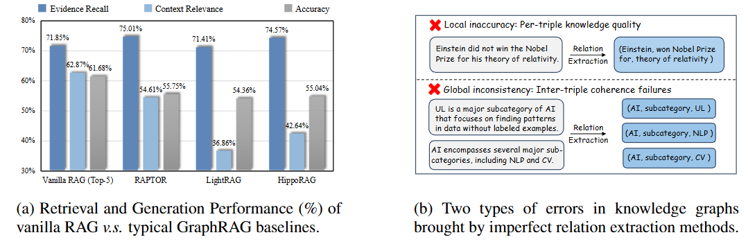 - 研究问题:这篇文章要解决的问题是现有基于图的检索增强生成(GraphRAG)系统在大规模非结构化语料库上的表现不佳。具体来说,这些系统在处理复杂的多跳推理任务时,由于依赖不稳定的关系提取,导致构建的图质量差,进而影响检索质量和生成准确性