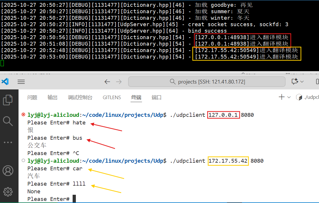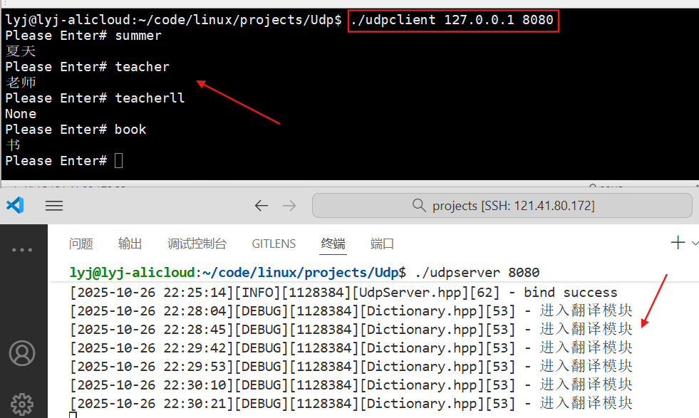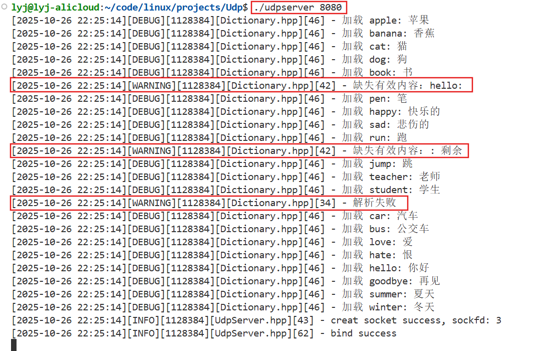 {if (argc != 2){std::cout << "Usage:" << argv[0] << " port" << std::endl;return 1;}uint16_t port = std::stoi(argv[1]);// 字典对象提供翻译功能Dictionary dict; // 实例化dictionary的对象dict.Load(); // 加载// 网络服务器对象提供通信功能Refresh_Log_To_Console();// lambda表达式的参数变为两个std::unique_ptr<UdpServer> server = std::make_unique<UdpServer>(port, [&dict](const std::string &w, InetAddr &addr) -> std::string { return dict.Translate(w, addr); });server->Init();server->Start();return 0;