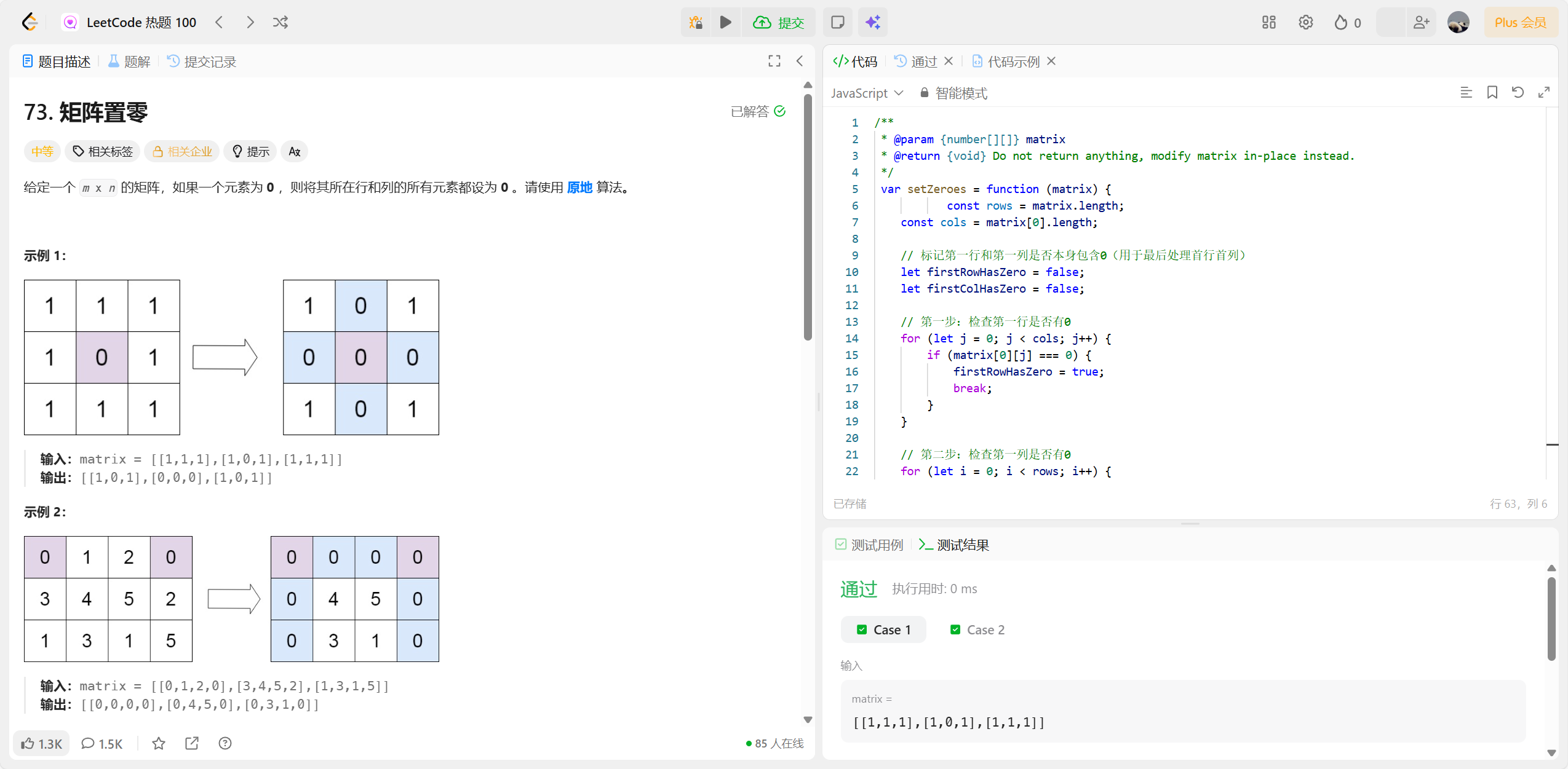var setZeroes = function (matrix) {const rows = matrix.length;const cols = matrix[0].length;// 标记第一行和第一列是否本身包含0(用于最后处理首行首列)let firstRowHasZero = false;let firstColHasZero = false;// 第一步:检查第一行是否有0for (let j = 0; j < cols; j++) {if (matrix[0][j] === 0) {firstRowHasZero = true;break;}}// 第二步:检查第一列是否有0for (let i = 0; i < rows; i++) {if (matrix[i][0] === 0) {firstColHasZero = true;break;}}// 第三步:用第一行和第一列标记其他行和列是否需要置零for (let i = 1; i < rows; i++) { // 从第1行开始(跳过首行)for (let j = 1; j < cols; j++) { // 从第1列开始(跳过首列)if (matrix[i][j] === 0) {// 用首行对应列标记该列需要置零matrix[0][j] = 0;// 用首列对应行标记该行列需要置零matrix[i][0] = 0;}}}// 第四步:根据首行首列的标记,将其他行和列置零for (let i = 1; i < rows; i++) {for (let j = 1; j < cols; j++) {// 如果当前行的首列是0,或当前列的首行是0,则置零if (matrix[i][0] === 0 || matrix[0][j] === 0) {matrix[i][j] = 0;}}}// 第五步:处理第一行(如果本身有0,整行置零)if (firstRowHasZero) {for (let j = 0; j < cols; j++) {matrix[0][j] = 0;}}// 第六步:处理第一列(如果本身有0,整列置零)if (firstColHasZero) {for (let i = 0; i < rows; i++) {matrix[i][0] = 0;}}