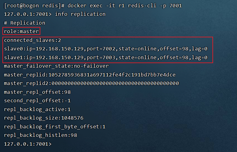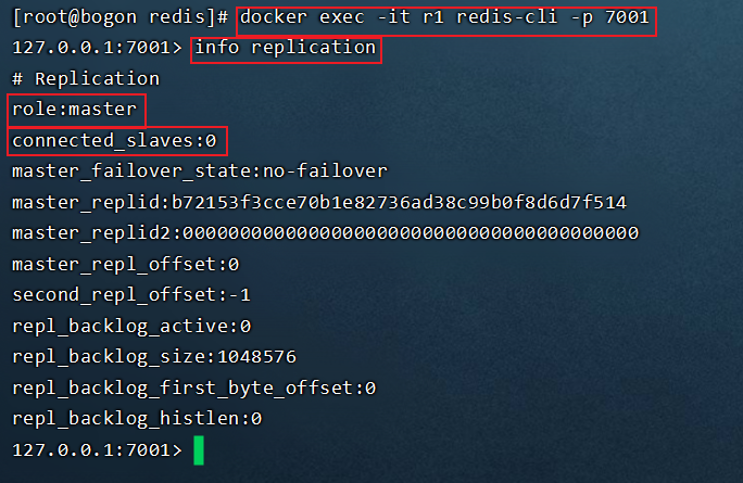 通过docker exec -it r1 redis-cli -p 7001以及info replication指令查看r1容器的信息:
