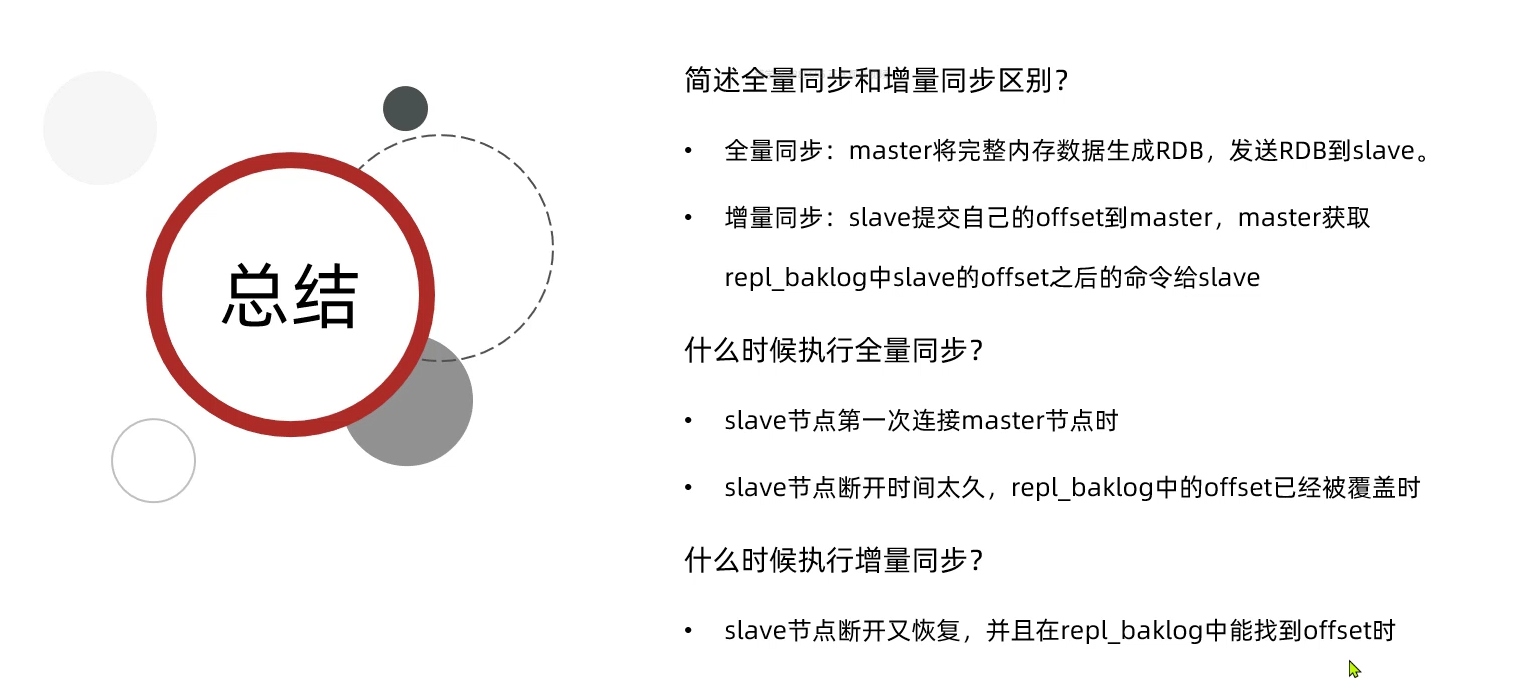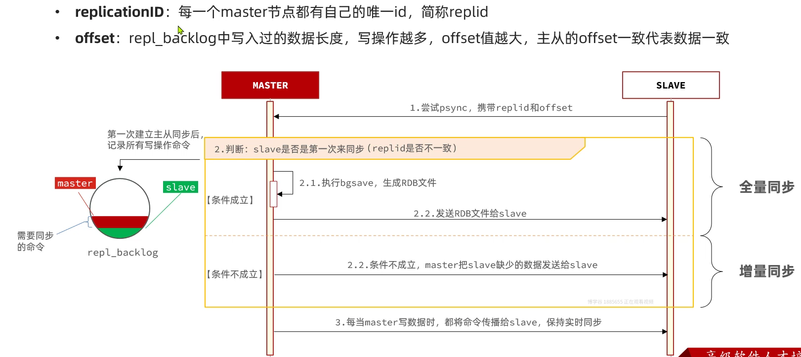 那么redis怎么知道这个slave是不是第一次来的呢?首先我们得知道每一个redis在构建主从关系之前都会有一个属于自己的replicationID(简称replid),当它们之间产生主从关系时,原有的replid会被统一替换成一个相同的replid表示主从关系(例如r1是r2的master,那么它们俩原有不同的replid会被一个相同的replid替换);当一个redis断开连接后,它的replid没有变化,下次相连时master发现它们俩的replid一样说明以前有连接过,就是通过这样的方式判断是否初次连接