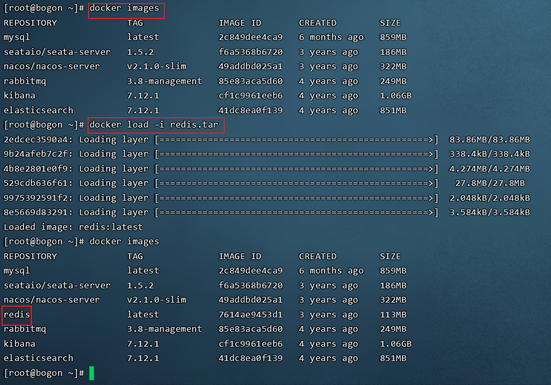 通过docker images命令发现我们并没有下载redis镜像,因此需要把资料当中的tar包复制到虚拟机当中,通过docker load -i redis.tar指令加载tar包并再次使用docker images命令查看: