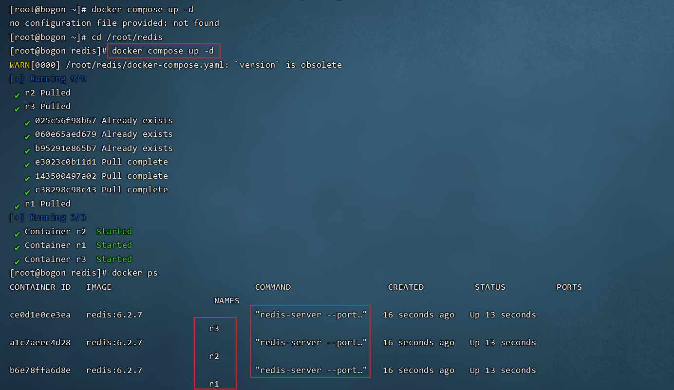 随后通过docker compose up -d命令运行集群(注意这里要cd到redis目录下才行):