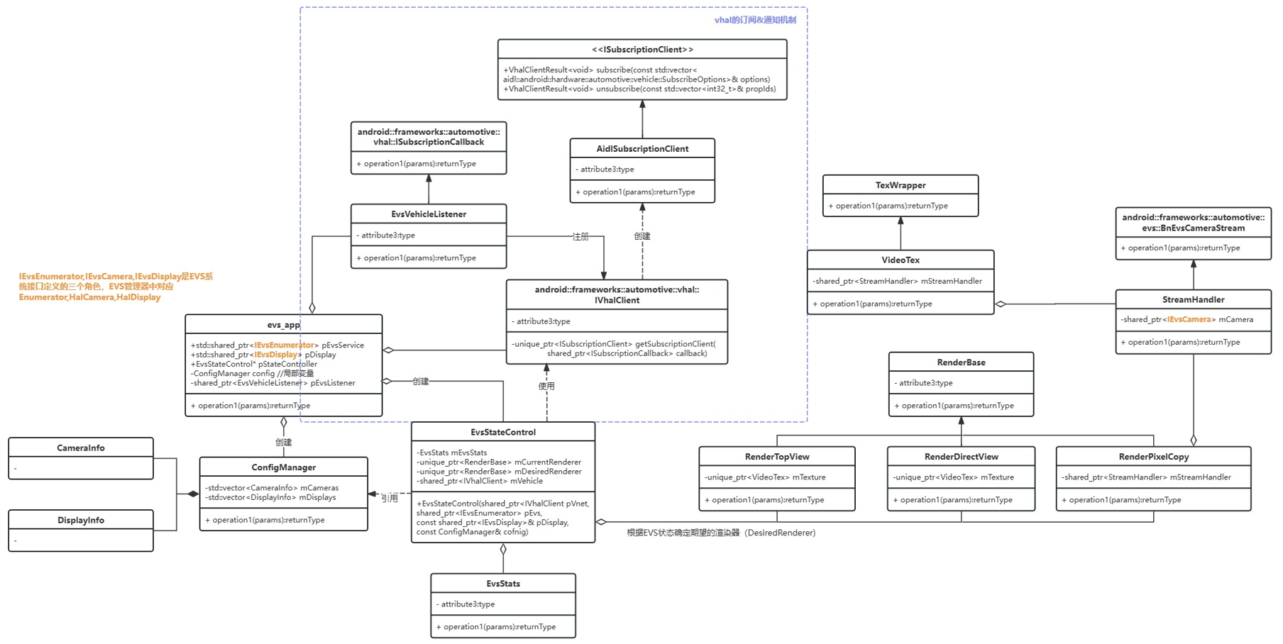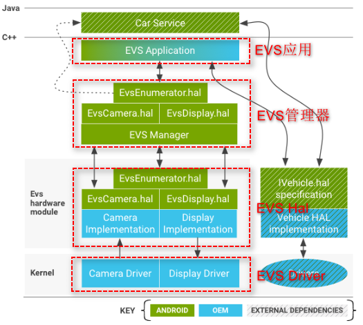 EVS作为Android Automotive的一部分,会涉及一些关联逻辑,上图蓝色虚线框是EVS App和VHal关联部分。