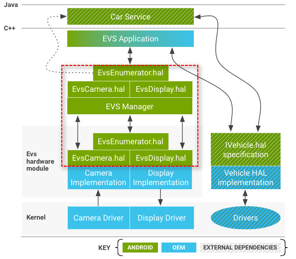 - 原始设备制造商负责实现由/hardware/interfaces/automotive/evs中定义的API