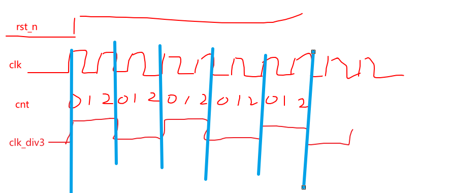 如下图显示的3分频,蓝色部分是原时钟的一个完成周期。