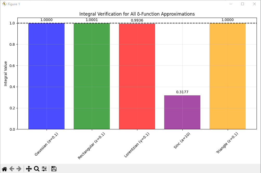 print("所有δ函数近似的积分验证 (应该都接近1)")