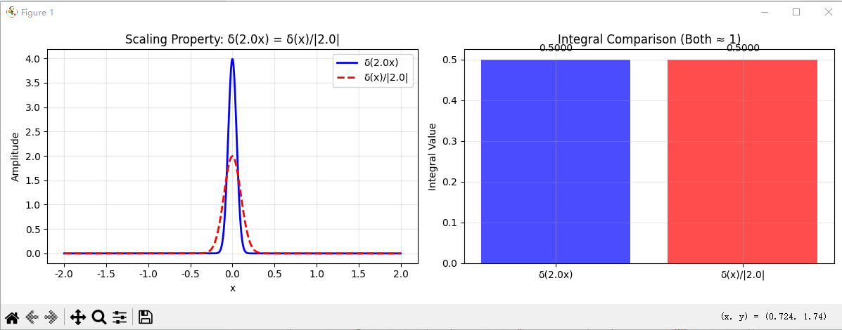 def test_scaling_property():"""测试缩放性质: δ(ax) = δ(x)/|a|"""x = np.linspace(-2, 2, 1000)a = 2.0 # 缩放因子sigma = 0.1# δ(ax)delta_ax = gaussian_approx(a * x, sigma)# δ(x)/|a|delta_scaled = gaussian_approx(x, sigma) / abs(a)plt.figure(figsize=(12, 4))plt.subplot(1, 2, 1)plt.plot(x, delta_ax, 'b-', label=f'δ({a}x)', linewidth=2)plt.plot(x, delta_scaled, 'r--', label=f'δ(x)/|{a}|', linewidth=2)plt.xlabel('x')plt.ylabel('Amplitude')plt.title(f'Scaling Property: δ({a}x) = δ(x)/|{a}|')plt.legend()plt.grid(True, alpha=0.3)# 验证积分相等dx = x[1] - x[0]integral_ax = np.sum(delta_ax) * dxintegral_scaled = np.sum(delta_scaled) * dxplt.subplot(1, 2, 2)methods = [f'δ({a}x)', f'δ(x)/|{a}|']integrals = [integral_ax, integral_scaled]plt.bar(methods, integrals, color=['blue', 'red'], alpha=0.7)plt.ylabel('Integral Value')plt.title('Integral Comparison (Both ≈ 1)')plt.grid(True, alpha=0.3)for i, v in enumerate(integrals):plt.text(i, v + 0.02, f'{v:.4f}', ha='center')plt.tight_layout()plt.show()print(f"缩放性质验证:")print(f"∫δ({a}x)dx = {integral_ax:.6f}")print(f"∫[δ(x)/|{a}|]dx = {integral_scaled:.6f}")test_scaling_property()# 4. 验证偶函数性质 (Even Function Property)