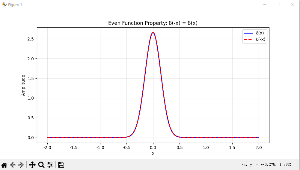 def test_even_property():"""测试偶函数性质: δ(-x) = δ(x)"""x = np.linspace(-2, 2, 1000)sigma = 0.15delta_x = gaussian_approx(x, sigma)delta_minus_x = gaussian_approx(-x, sigma)plt.figure(figsize=(10, 5))plt.plot(x, delta_x, 'b-', label='δ(x)', linewidth=2)plt.plot(x, delta_minus_x, 'r--', label='δ(-x)', linewidth=2)plt.xlabel('x')plt.ylabel('Amplitude')plt.title('Even Function Property: δ(-x) = δ(x)')plt.legend()plt.grid(True, alpha=0.3)# 计算最大差异max_diff = np.max(np.abs(delta_x - delta_minus_x))print(f"偶函数性质验证:")print(f"δ(x) 和 δ(-x) 的最大差异: {max_diff:.6e} (应该接近0)")plt.show()test_even_property()# 5. 验证复合函数性质