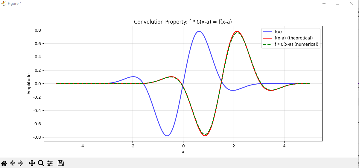 def test_convolution_property():"""测试卷积性质: f * δ(x-a) = f(x-a)"""x = np.linspace(-5, 5, 1000)dx = x[1] - x[0]# 测试函数def f(x):return np.exp(-x**2/2) * np.sin(2*x)a = 1.5 # 平移量sigma = 0.1# δ(x-a)delta_shifted = gaussian_approx(x - a, sigma)# 数值卷积convolution = np.convolve(f(x), delta_shifted, mode='same') * dx# 理论结果: f(x-a)theoretical = f(x - a)plt.figure(figsize=(12, 5))plt.plot(x, f(x), 'b-', label='f(x)', linewidth=2, alpha=0.7)plt.plot(x, theoretical, 'r-', label='f(x-a) (theoretical)', linewidth=2)plt.plot(x, convolution, 'g--', label='f * δ(x-a) (numerical)', linewidth=2)plt.xlabel('x')plt.ylabel('Amplitude')plt.title('Convolution Property: f * δ(x-a) = f(x-a)')plt.legend()plt.grid(True, alpha=0.3)# 计算误差error = np.max(np.abs(convolution - theoretical))print(f"卷积性质验证:")print(f"最大误差: {error:.6f}")plt.show()test_convolution_property()# 7. 总结:所有近似的积分验证