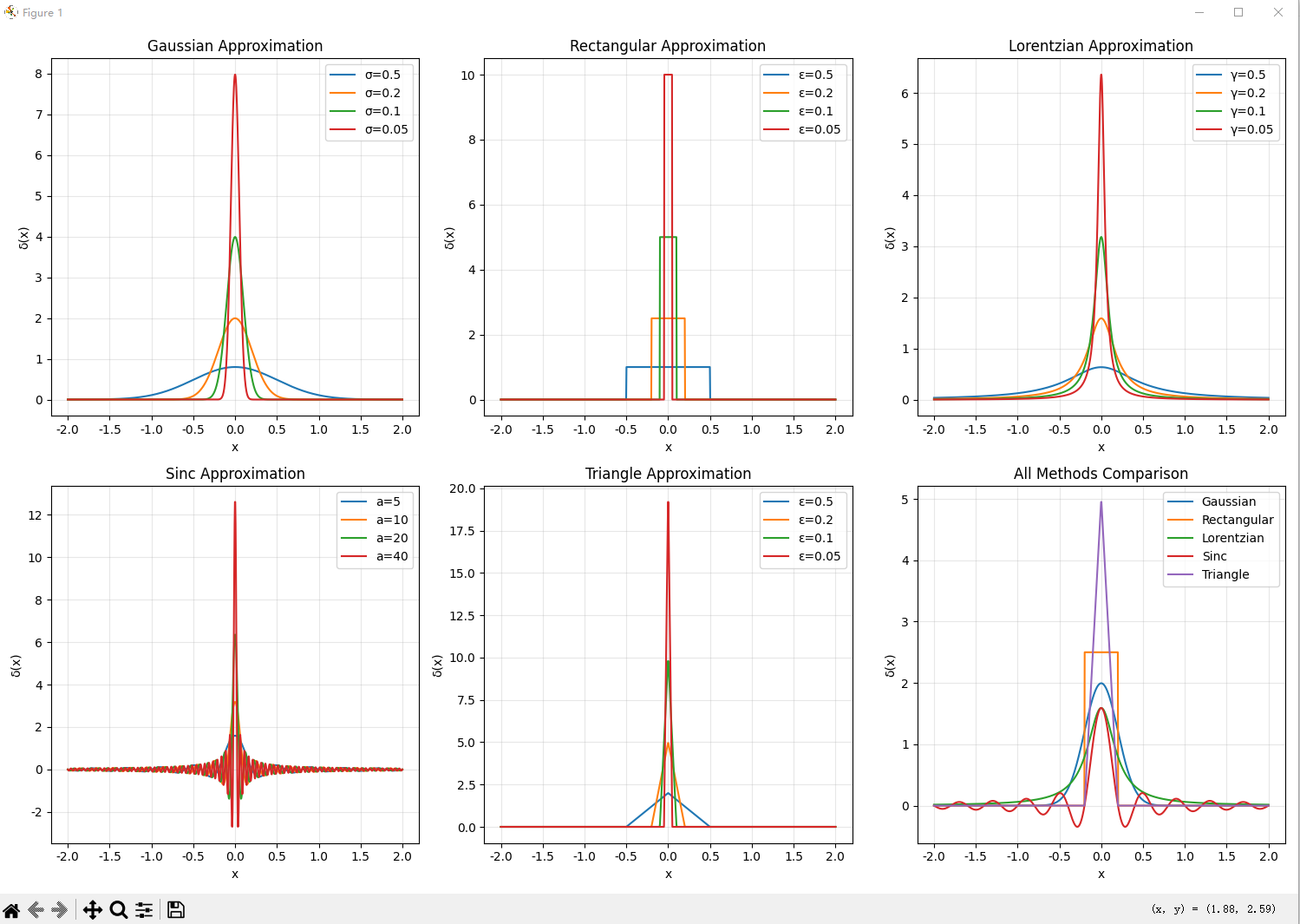 def gaussian_approx(x, sigma):"""高斯函数近似"""return np.exp(-x**2/(2*sigma**2)) / (sigma * np.sqrt(2*np.pi))def rect_approx(x, epsilon):"""矩形函数近似"""return np.where(np.abs(x) <= epsilon, 1/(2*epsilon), 0)def lorentz_approx(x, gamma):"""洛伦兹函数近似"""return gamma / (np.pi * (x**2 + gamma**2))def sinc_approx(x, a):"""sinc函数近似"""return np.sinc(x * a) * a / np.pidef triangle_approx(x, epsilon):"""三角波函数近似"""return np.where(np.abs(x) <= epsilon, (epsilon - np.abs(x))/epsilon**2, 0)# 创建坐标轴