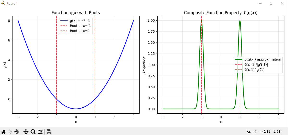 def test_composite_property():"""测试复合函数性质: δ(g(x))"""x = np.linspace(-3, 3, 1000)# 定义 g(x) = x² - 1,根在 x = ±1def g(x):return x**2 - 1# 使用性质: δ(g(x)) = Σ δ(x-xᵢ)/|g'(xᵢ)|roots = [-1, 1] # g(x) = 0 的根derivatives = [abs(2*root) for root in roots] # |g'(xᵢ)|sigma = 0.1delta_composite = np.zeros_like(x)for root, deriv in zip(roots, derivatives):delta_composite += gaussian_approx(x - root, sigma) / derivplt.figure(figsize=(12, 5))plt.subplot(1, 2, 1)plt.plot(x, g(x), 'b-', label='g(x) = x² - 1', linewidth=2)plt.axhline(y=0, color='k', linestyle='-', alpha=0.3)for root in roots:plt.axvline(x=root, color='r', linestyle='--', alpha=0.7, label=f'Root at x={root}')plt.xlabel('x')plt.ylabel('g(x)')plt.title('Function g(x) with Roots')plt.legend()plt.grid(True, alpha=0.3)plt.subplot(1, 2, 2)plt.plot(x, delta_composite, 'g-', label='δ(g(x)) approximation', linewidth=2)for root, deriv in zip(roots, derivatives):plt.axvline(x=root, color='r', linestyle='--', alpha=0.7, label=f'δ(x-{root})/|g\'({root})|')plt.xlabel('x')plt.ylabel('Amplitude')plt.title('Composite Function Property: δ(g(x))')plt.legend()plt.grid(True, alpha=0.3)plt.tight_layout()plt.show()test_composite_property()# 6. 验证卷积性质 (Convolution Property)