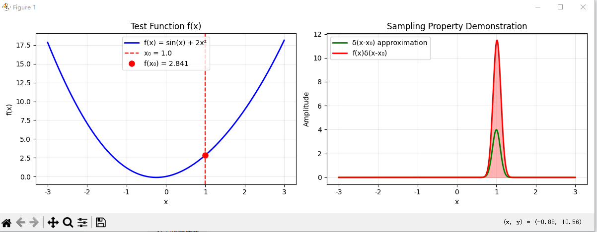 print("验证筛选性质: ∫f(x)δ(x-x₀)dx = f(x₀)")def test_sampling_property():"""测试筛选性质"""# 测试函数def f(x):return np.sin(x) + 2*x**2x0 = 1.0 # 采样点x_range = np.linspace(-3, 3, 1000)dx = x_range[1] - x_range[0]# 使用高斯近似sigma = 0.1delta_approx = gaussian_approx(x_range - x0, sigma)# 计算积分integral = np.sum(f(x_range) * delta_approx) * dxexact_value = f(x0)print(f"数值积分结果: {integral:.6f}")print(f"精确值 f({x0}): {exact_value:.6f}")print(f"相对误差: {abs(integral - exact_value)/abs(exact_value)*100:.4f}%")# 绘图展示plt.figure(figsize=(12, 4))plt.subplot(1, 2, 1)plt.plot(x_range, f(x_range), 'b-', label='f(x) = sin(x) + 2x²', linewidth=2)plt.axvline(x=x0, color='r', linestyle='--', label=f'x₀ = {x0}')plt.plot(x0, exact_value, 'ro', markersize=8, label=f'f(x₀) = {exact_value:.3f}')plt.xlabel('x')plt.ylabel('f(x)')plt.title('Test Function f(x)')plt.legend()plt.grid(True, alpha=0.3)plt.subplot(1, 2, 2)plt.plot(x_range, delta_approx, 'g-', label='δ(x-x₀) approximation', linewidth=2)plt.plot(x_range, f(x_range) * delta_approx, 'r-', label='f(x)δ(x-x₀)', linewidth=2)plt.fill_between(x_range, f(x_range) * delta_approx, alpha=0.3, color='red')plt.xlabel('x')plt.ylabel('Amplitude')plt.title('Sampling Property Demonstration')plt.legend()plt.grid(True, alpha=0.3)plt.tight_layout()plt.show()return integral, exact_valuetest_sampling_property()# 3. 验证缩放性质 (Scaling Property)