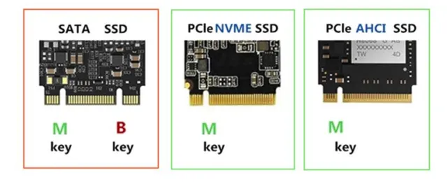 M.2接口按金手指的类型又可细分为M-Key、B&M-Key及B-Key。它们的接口有所差异,支持的协议也不尽相同。B-key 通常用于 SATA 总线,而 M-key 则是为 PCIe 总线设计的,支持更高的传输速度。