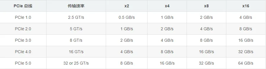 PCIe 总线常见的有 PCIe 3.0 、PCIe 4.0,PCIe 5.0版本越高,传输速度就越快,并且通道数量不同,速度也会不同!PCIe 插槽有不同的物理配置:x1、x4、x8、x16、x32。x 后面的数字告诉您 PCIe 插槽有多少个通道(数据如何传入和传出 PCIe 卡)。