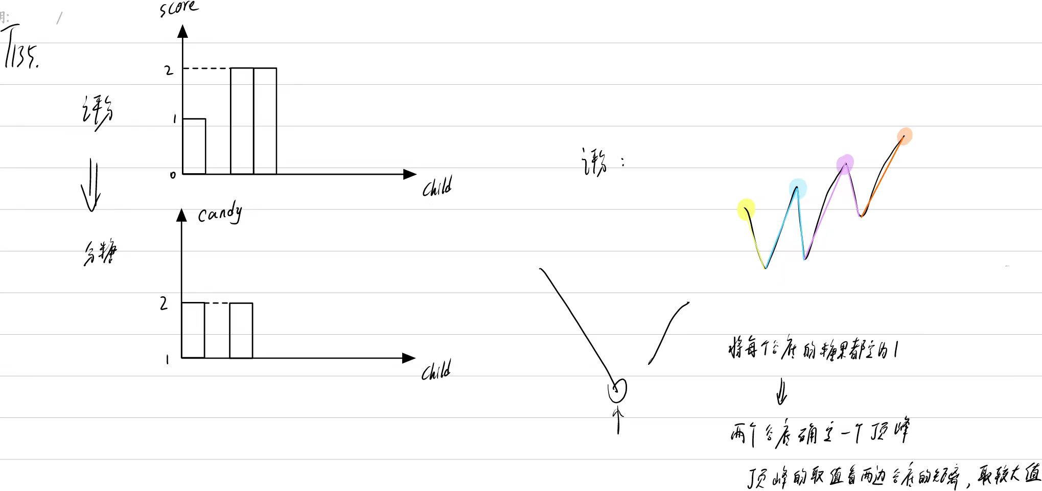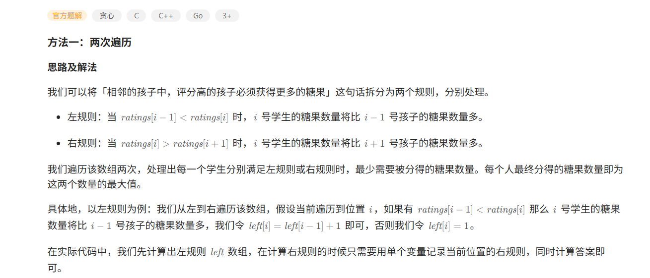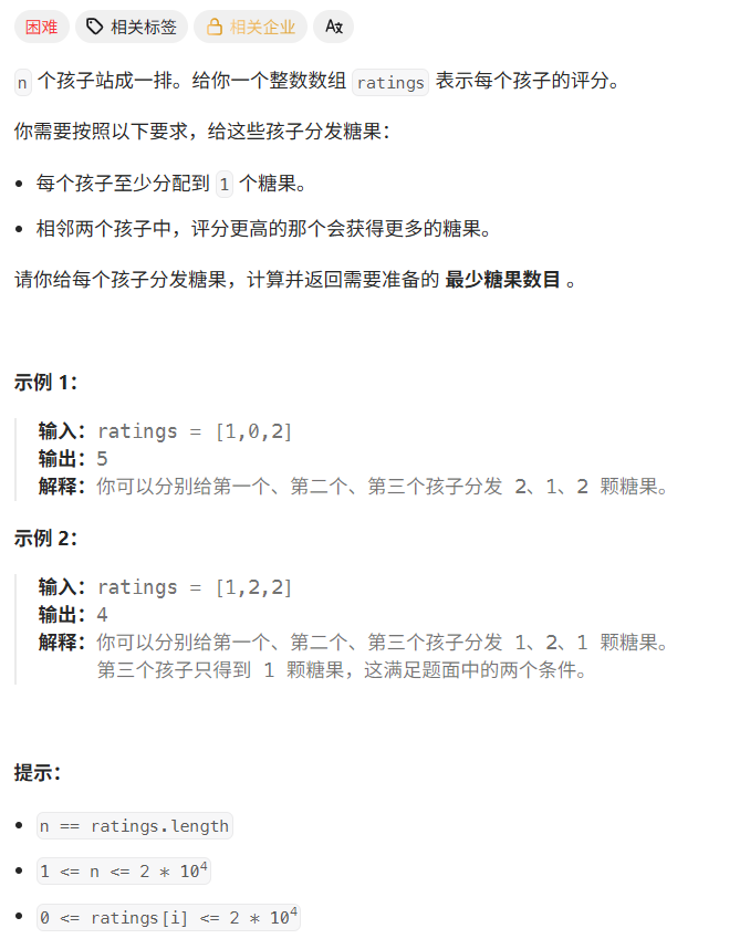 class Solution {public int candy(int[] ratings) {int n = ratings.length;int[] left = new int[n];for (int i = 0; i < n; i++) {if (i > 0 && ratings[i] > ratings[i - 1]) {left[i] = left[i - 1] + 1;} else {left[i] = 1;}}int right = 0, ret = 0;for (int i = n - 1; i >= 0; i--) {if (i < n - 1 && ratings[i] > ratings[i + 1]) {right++;} else {right = 1;}ret += Math.max(left[i], right);}return ret;}