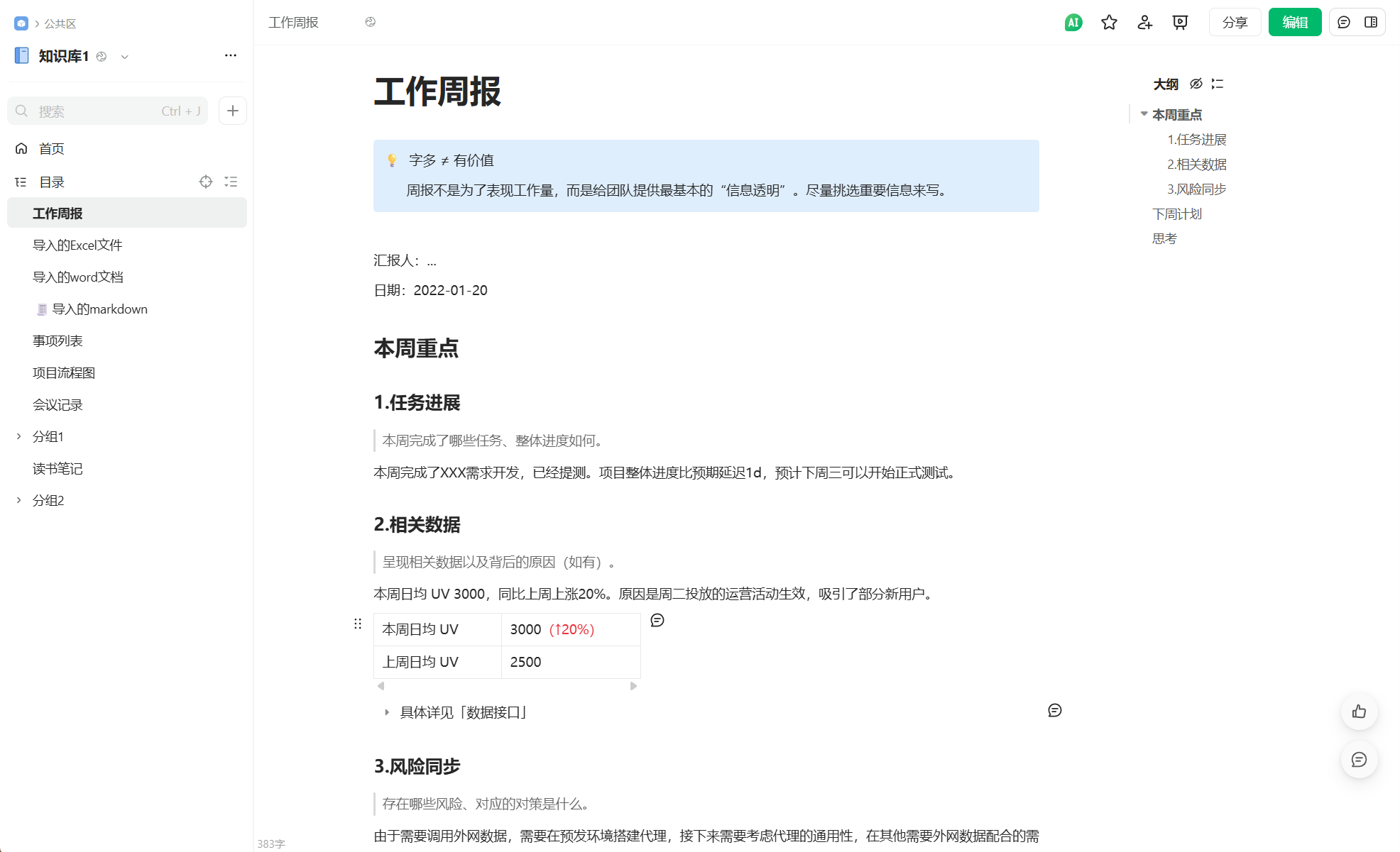 支持在线创建、编辑富文本文档;文档评审与版本管理;可导入并查看markdown