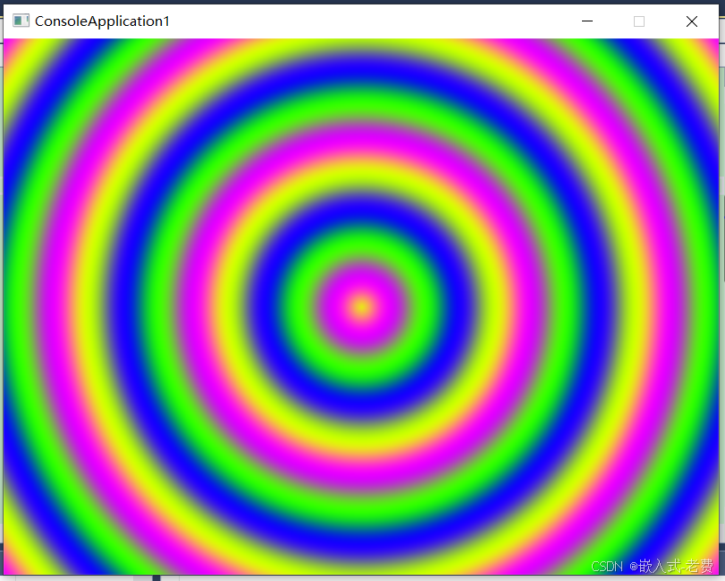 {int w = 640;int h = 480;DWORD* buf = NULL;initgraph(w, h);BeginBatchDraw();buf = GetImageBuffer(); // get basic address of image bufferdouble t = 0.0;while (!_kbhit()){for (int y = 0; y < h; y++){for (int x = 0; x < w; x++){double dx = x - w / 2.0;double dy = y - h / 2.0;double r = sqrt(dx * dx + dy * dy);double v = sin(r / 10.0 - t) * 0.5 + 0.5;int R = (int)(v * 255);int G = (int)((1 - v) * 255);int B = (int)(128 + 127 * sin(t + r / 20.0));putpixel(x, y, RGB(B, G, R));}}FlushBatchDraw();Sleep(20);t += 0.2;}EndBatchDraw();closegraph();return 0;