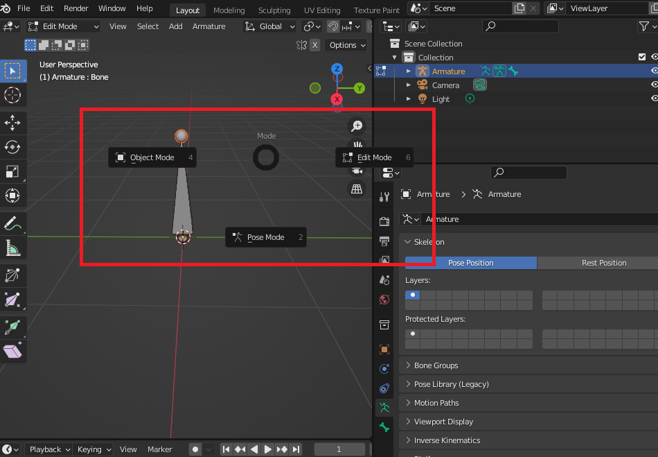 2.添加后按Tab可切换至骨骼编辑模式,按Ctrl+Tab可在3种编辑模式下切换