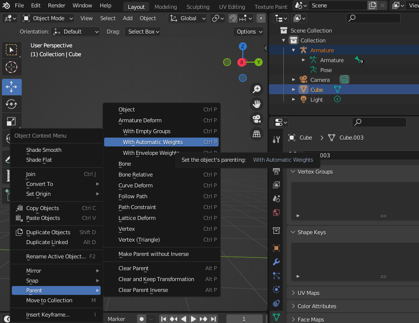 8.进行绑定操作,Blender中绑定需先后选中模型与骨骼,然后右键Parent-With Automatic Weights。自动上权重。