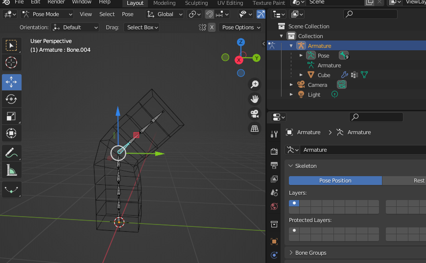 9.最后切回骨骼Pose模式,旋转骨骼测试绑定效果。