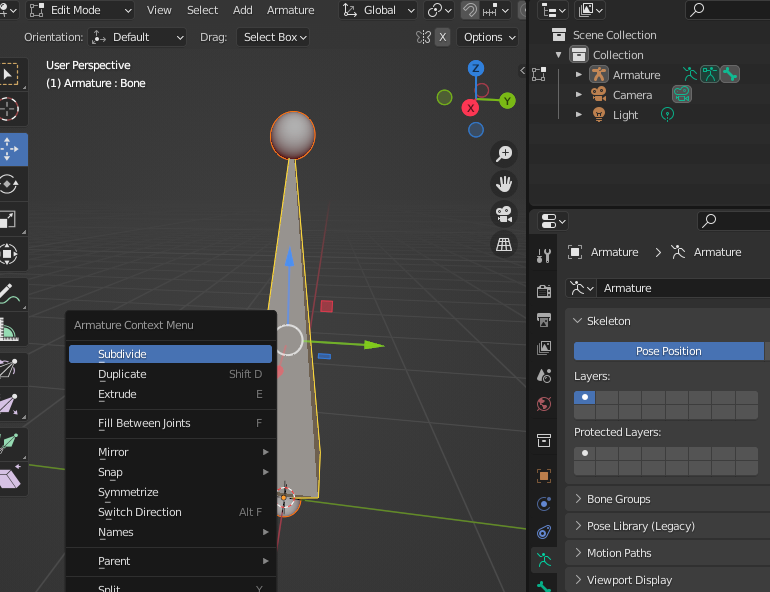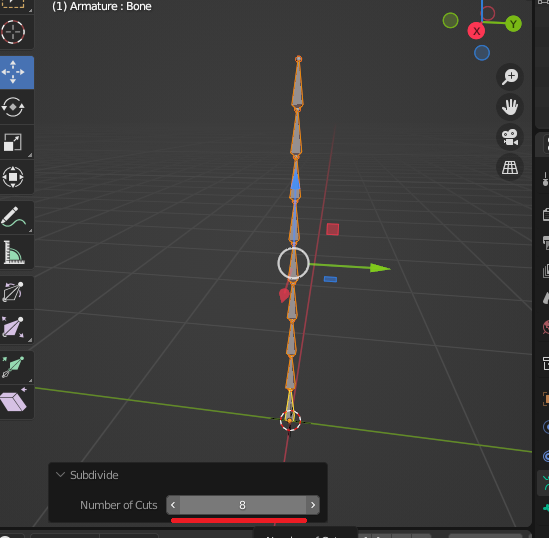 5.除了一个个创建骨骼,Blender提供了区别于其他软件的功能,骨骼细分。右键骨骼可点出骨骼细分。