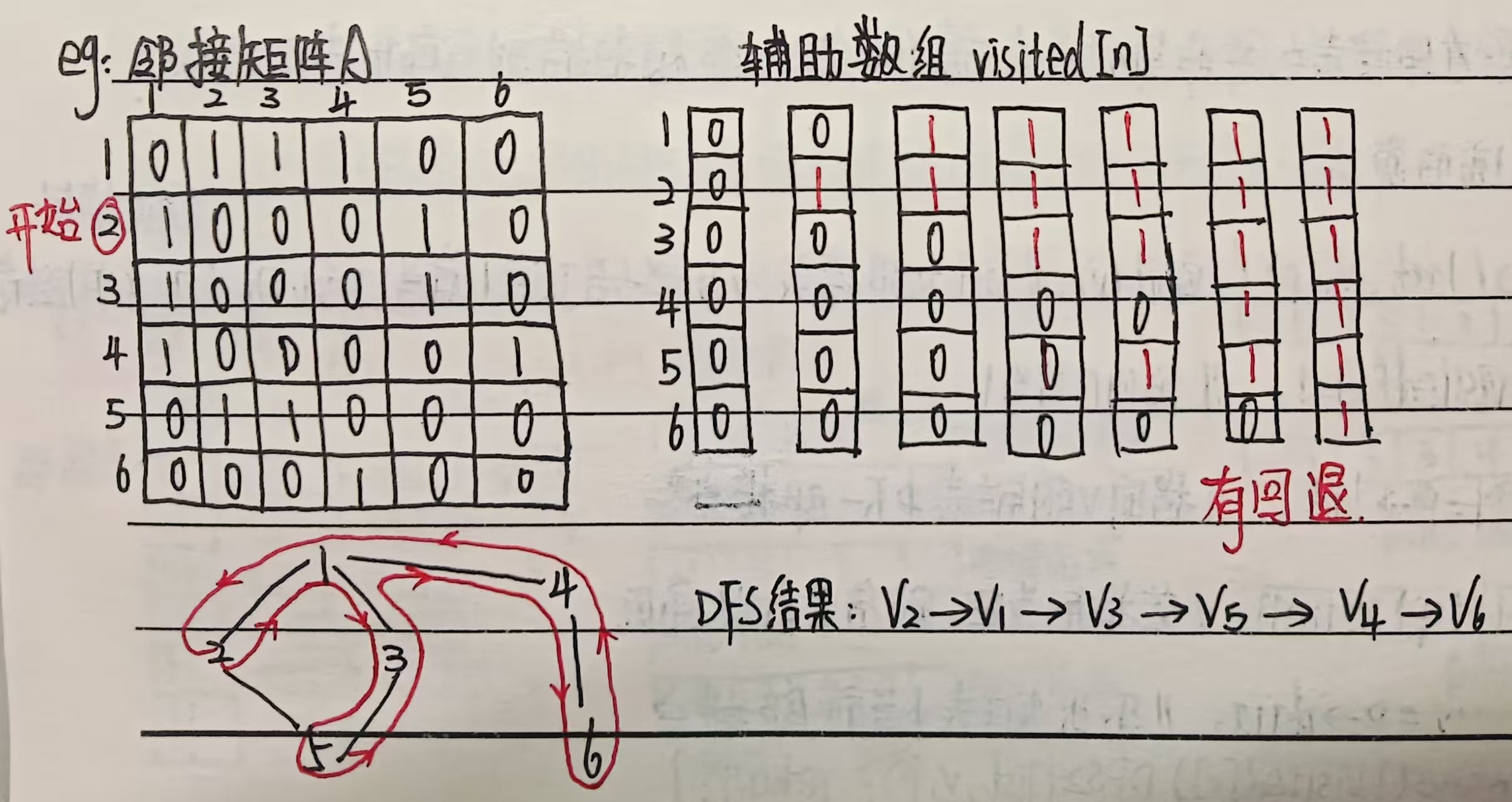 - 图的 DFS 通过递归深入邻接顶点,直到所有邻接顶点均已访问(无未访问分支可走)。