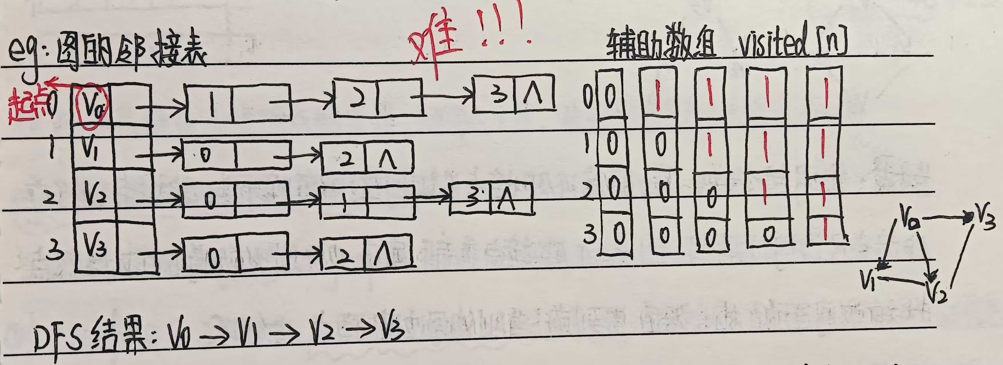 - 图可能有环(如顶点 0-1-3-2-0),DFS 必须通过