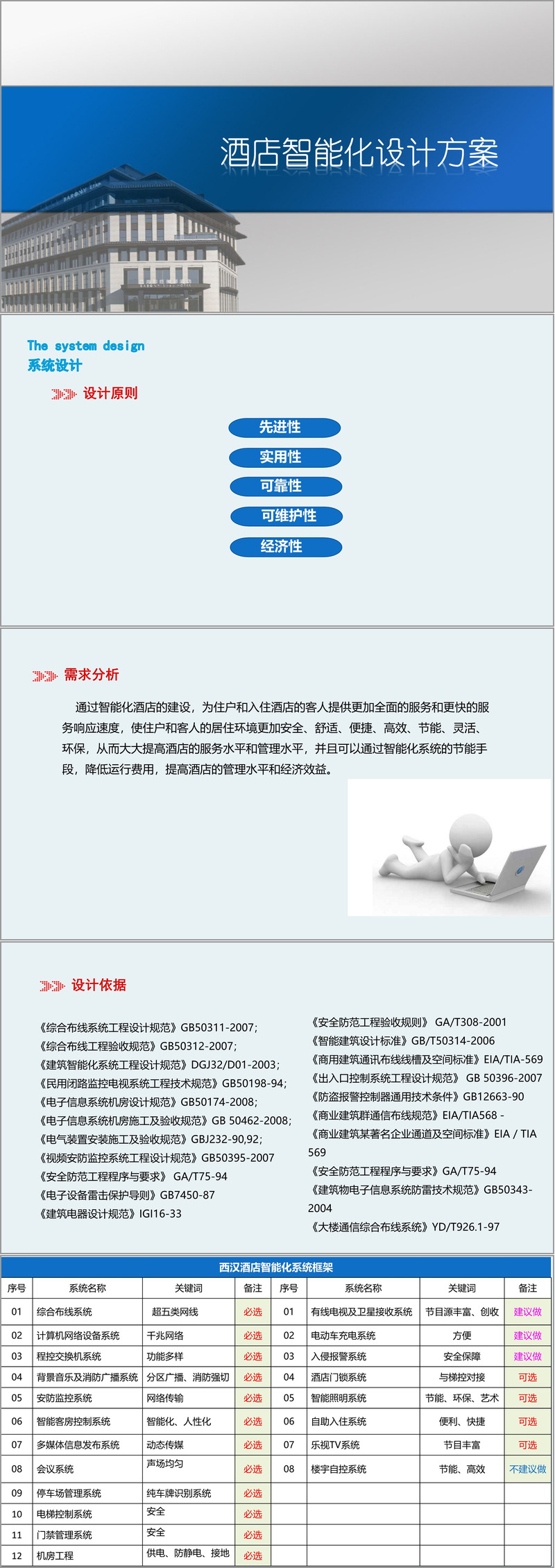 在需求分析部分,方案明确提出智能化系统需实现安全、舒适、便捷、高效、节能、灵活与环保的多重目标,既服务于住户和客人,也助力酒店降低运营成本并提升管理效能。所有设计严格遵循国家及行业标准,包括《综合布线系统工程设计规范》《智能建筑设计标准》《安全防范工程程序与要求》等二十余项技术规范,确保系统建设的合规性与专业性。