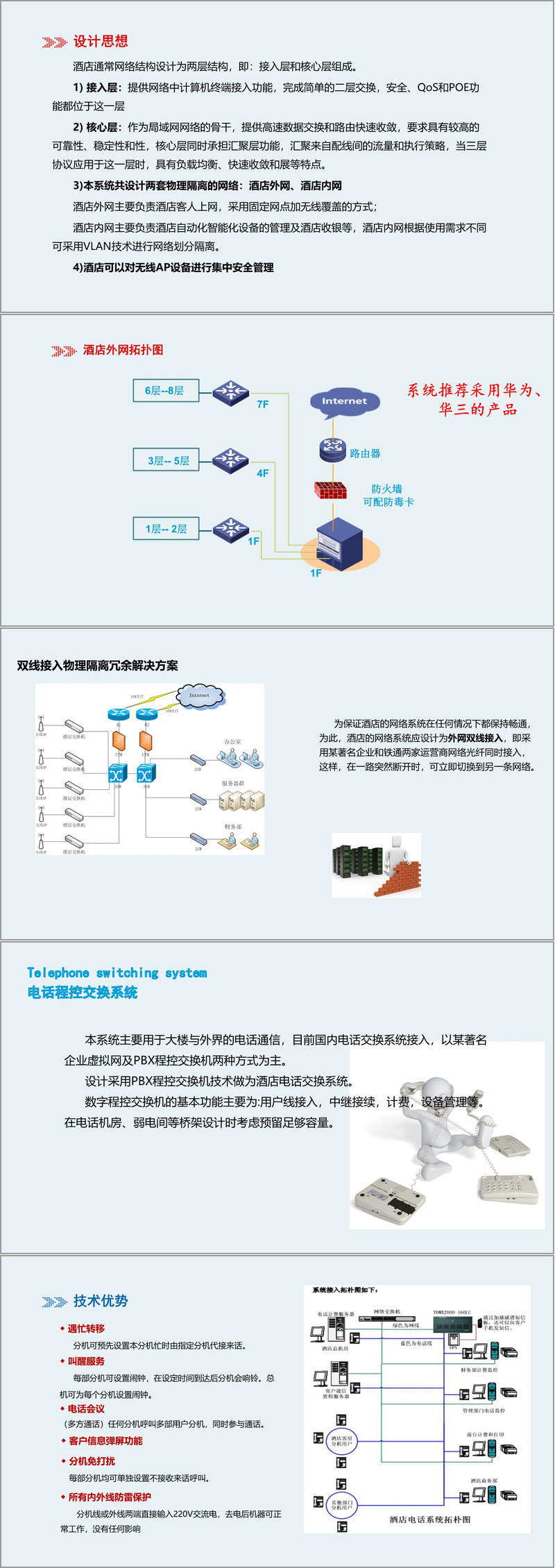 电话系统以PBX程控交换技术为基础,提供呼叫转移、闹钟服务、电话会议、客户信息弹屏、免打扰及全线防雷等高级功能,显著增强通信体验与安全性。