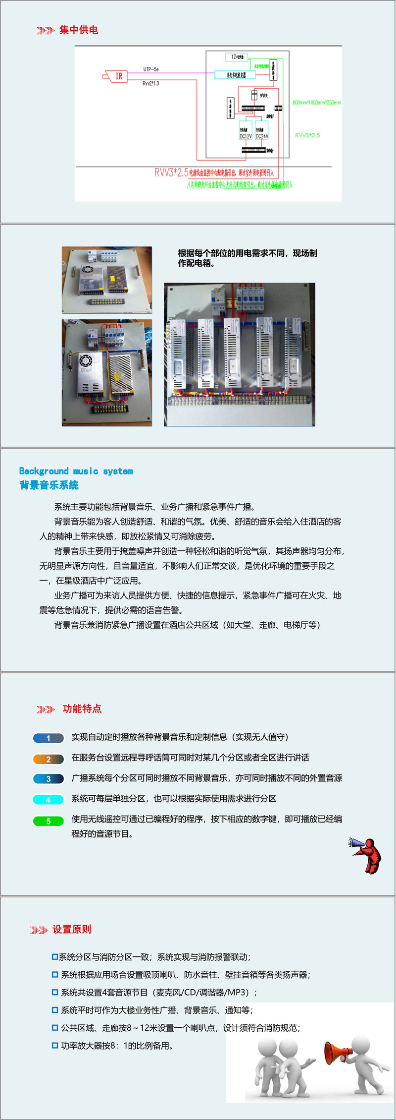 背景音乐与紧急广播系统融合业务与消防需求,支持分区播放、远程寻呼及多音源输入,扬声器按8–12米间距设置,功率放大器按8:1比例冗余配置,兼顾音质与可靠性。