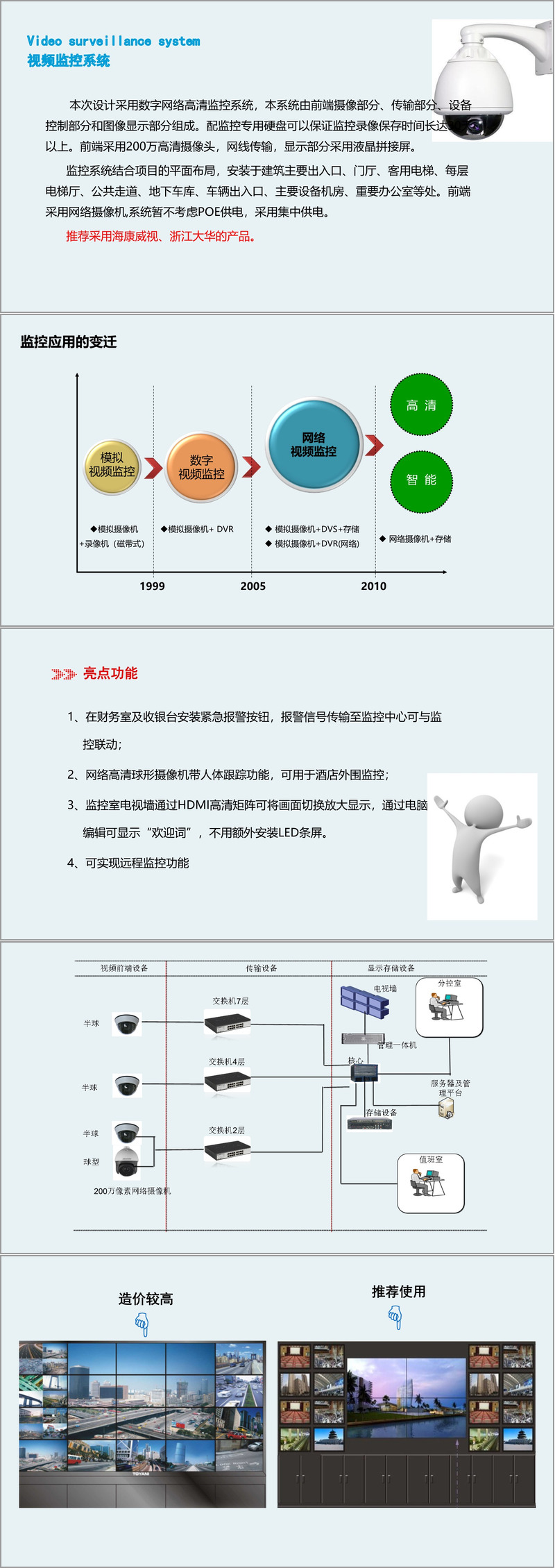 视频监控系统全面覆盖公共区域及重点房间,采用200万像素网络高清摄像头,支持30天存储及人体跟踪功能。紧急报警按钮可与监控联动,电视墙支持欢迎词编辑,体现人机协同的安防理念。