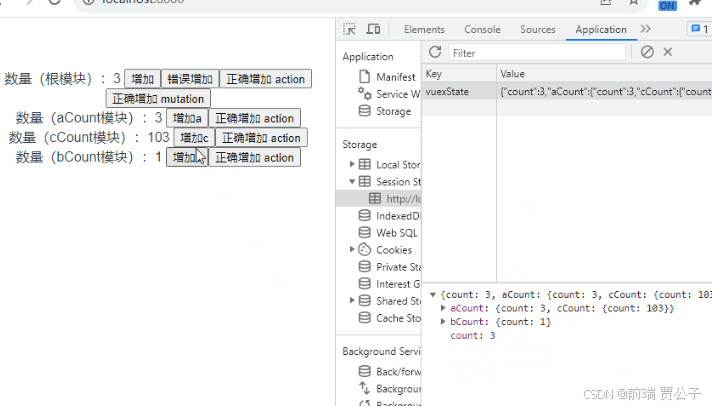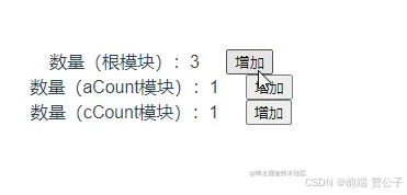 <template>数量(根模块):{{$store.state.count}} <button @click="$store.state.count++">增加</button><br>数量(aCount模块):{{$store.state.aCount.count}} <button @click="$store.state.aCount.count++">增加</button><br>数量(cCount模块):{{$store.state.aCount.cCount.count}} <button @click="$store.state.aCount.cCount.count++">增加</button><br>