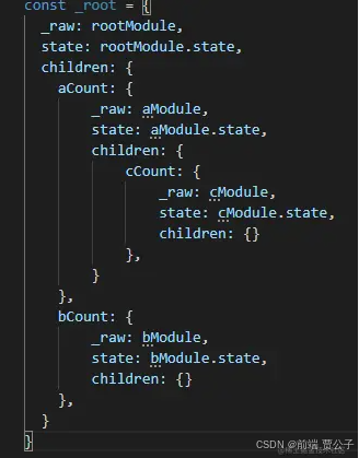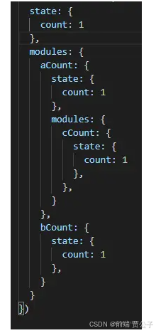 import { createStore } from 'vuex'export default createStore({// strict: true,state: {count: 1},// ...modules: {aCount: {state: {count: 1},modules: {cCount: {state: {count: 1},},}},bCount: {state: {count: 1},}}