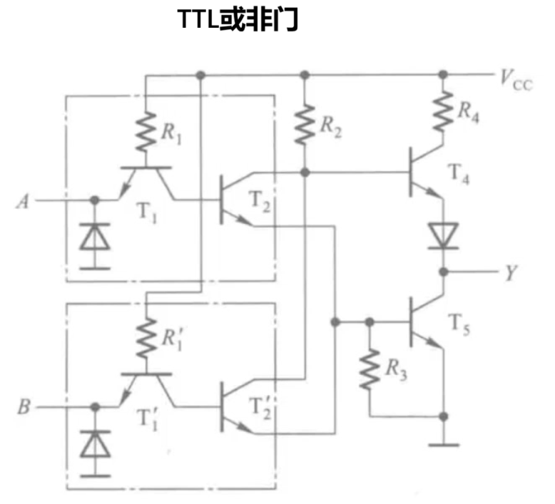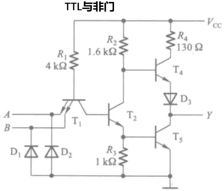 所谓的TTL与非门其实就是在原本的反相器的T1管子引出两个输入端。