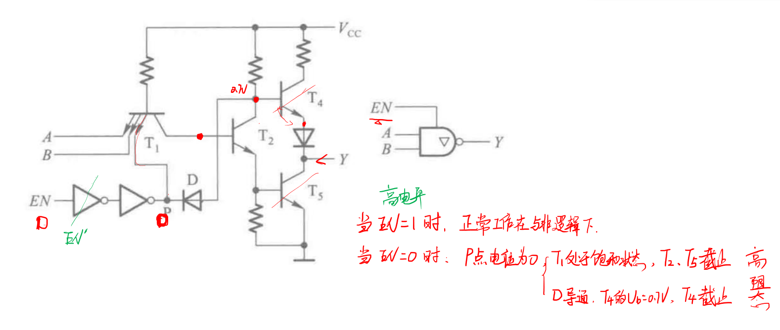 TTL的三态门思考逻辑比CMOS的三态门简单,他的思考逻辑十分连贯。就是想让使能端可以控制输入端电平,从而先截止T5,让其工作在上拉作用下。然后再把上拉的T4左边、下方分别接一个二极管钳位,使得T4的b端电位不足以导通两个PN结而截止。