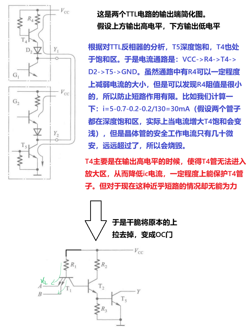 于是在TTL门电路中,我们也希望它和OD门类似。我们把原本用于上拉输出的R4、T4管子、D2二极管这些全都去掉,然后在外面需要的时候再添加上拉电阻,从而达到与OD门一致的效果。