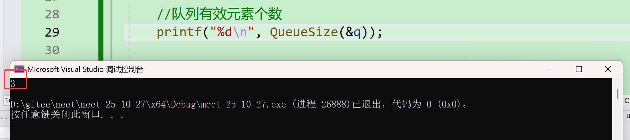 {assert(pq);QueueNode* pcur = pq->phead;int size = 0;while (pcur){++size;pcur = pcur->next;}return size;