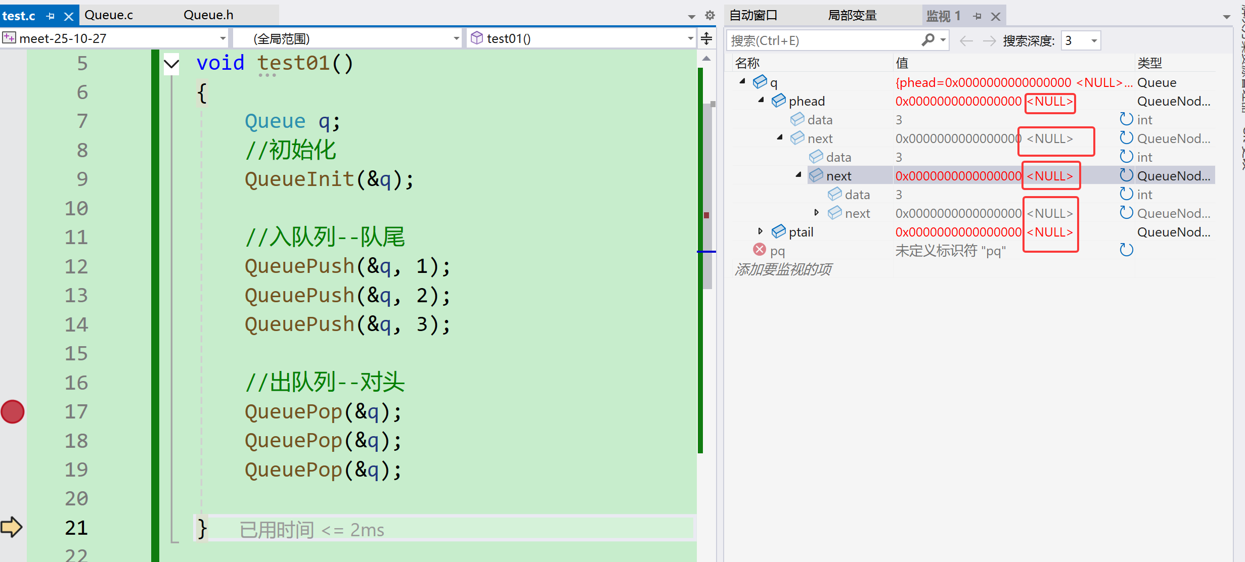 {assert(!QueueEmpty(pq));//队列中只有一个节点if (pq->phead == pq->ptail){free(pq->phead);pq->phead = pq->ptail = NULL;}else{QueueNode* next = pq->phead->next;free(pq->phead);pq->phead = next;}