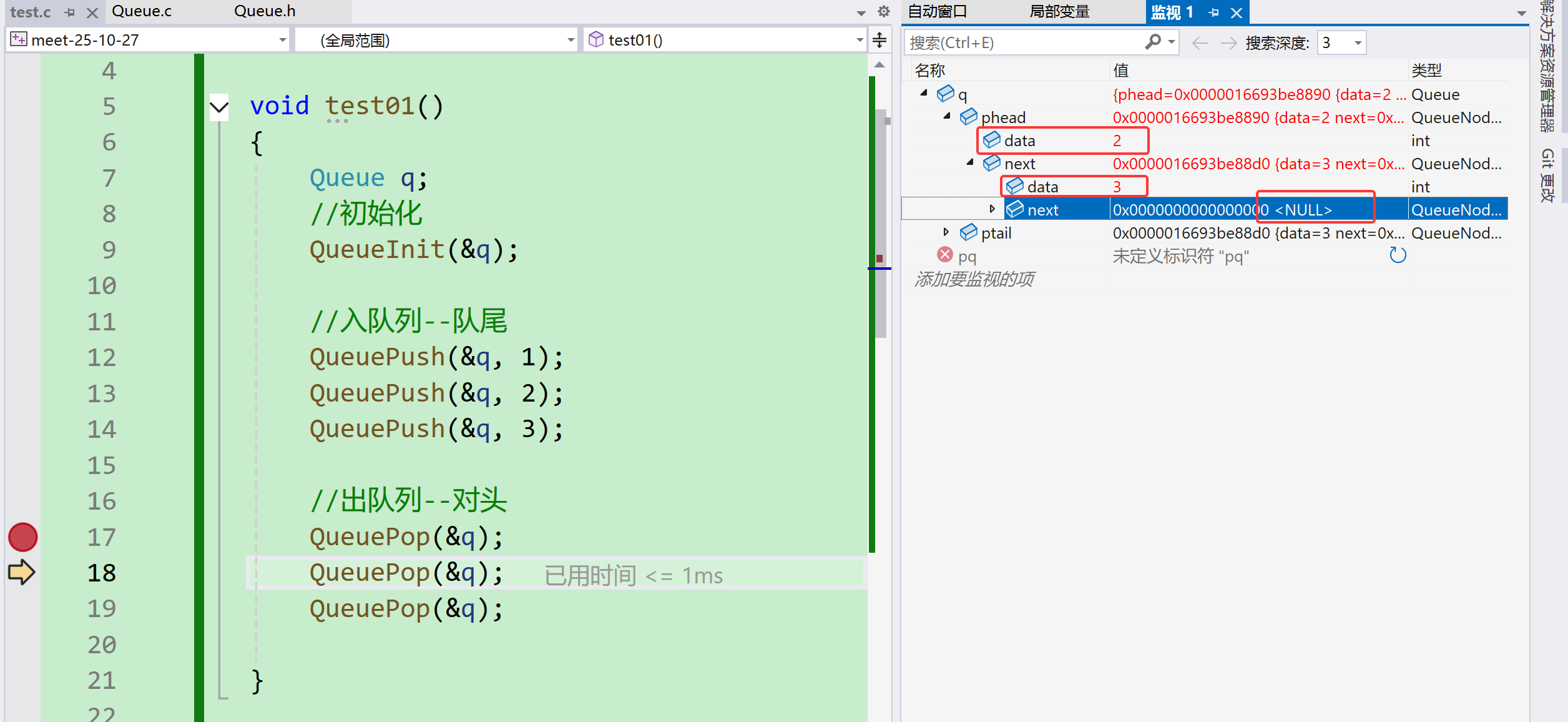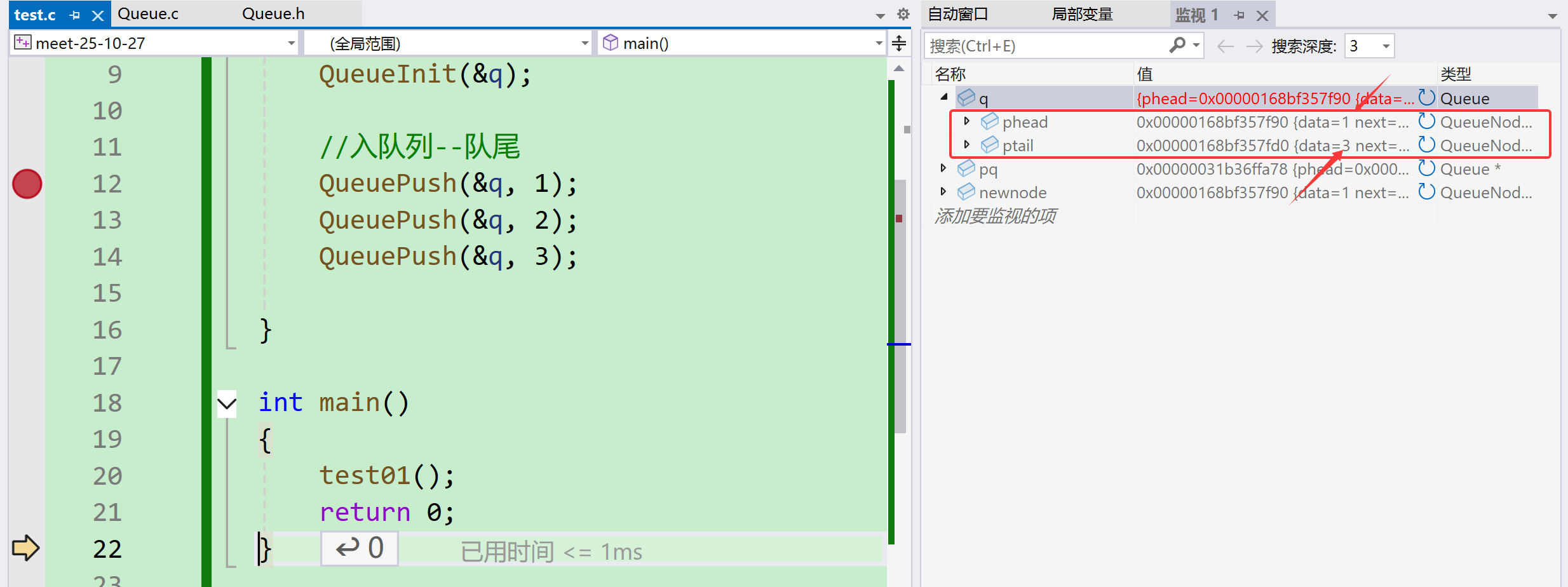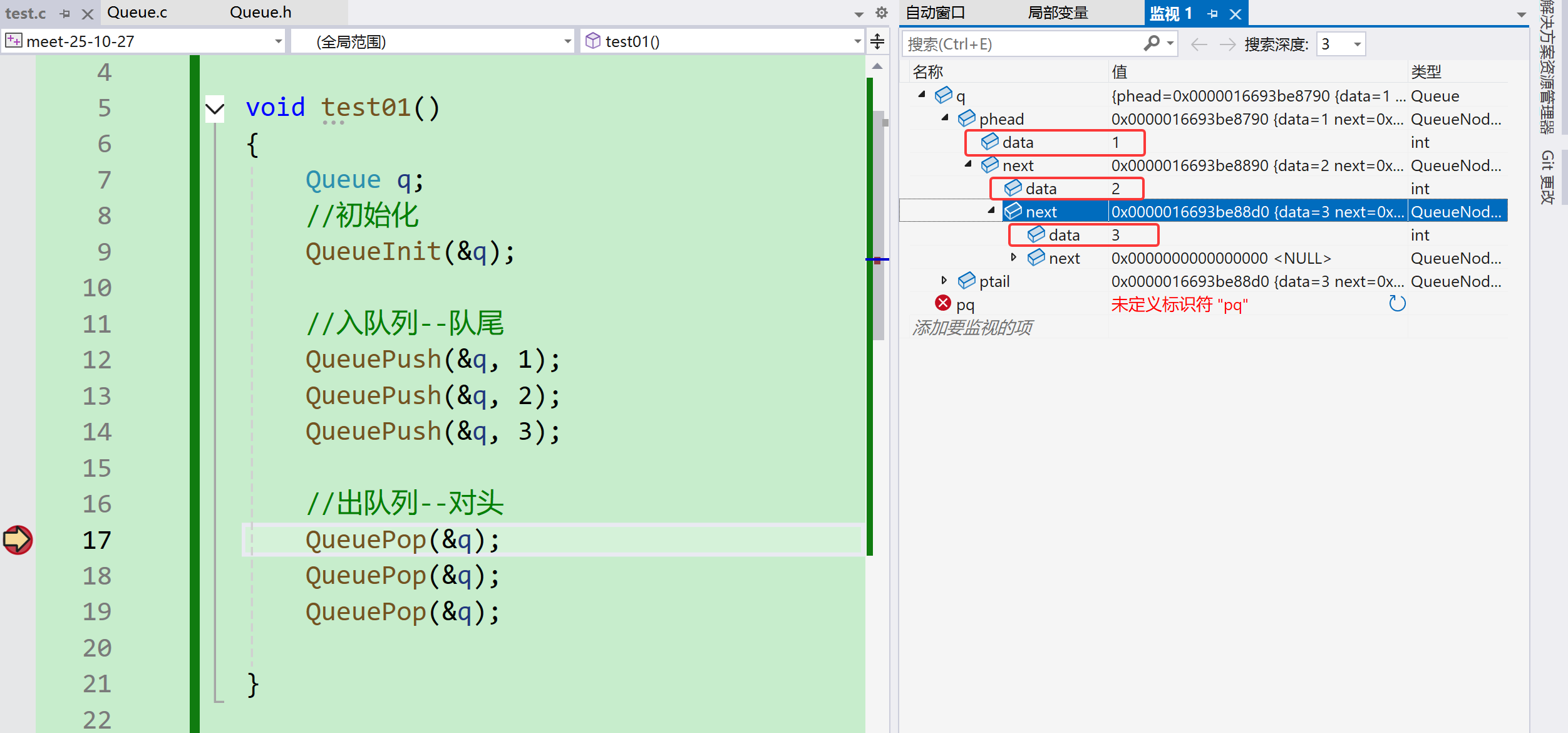 如图调试可得:对头为1,队尾为3,入队列成功。