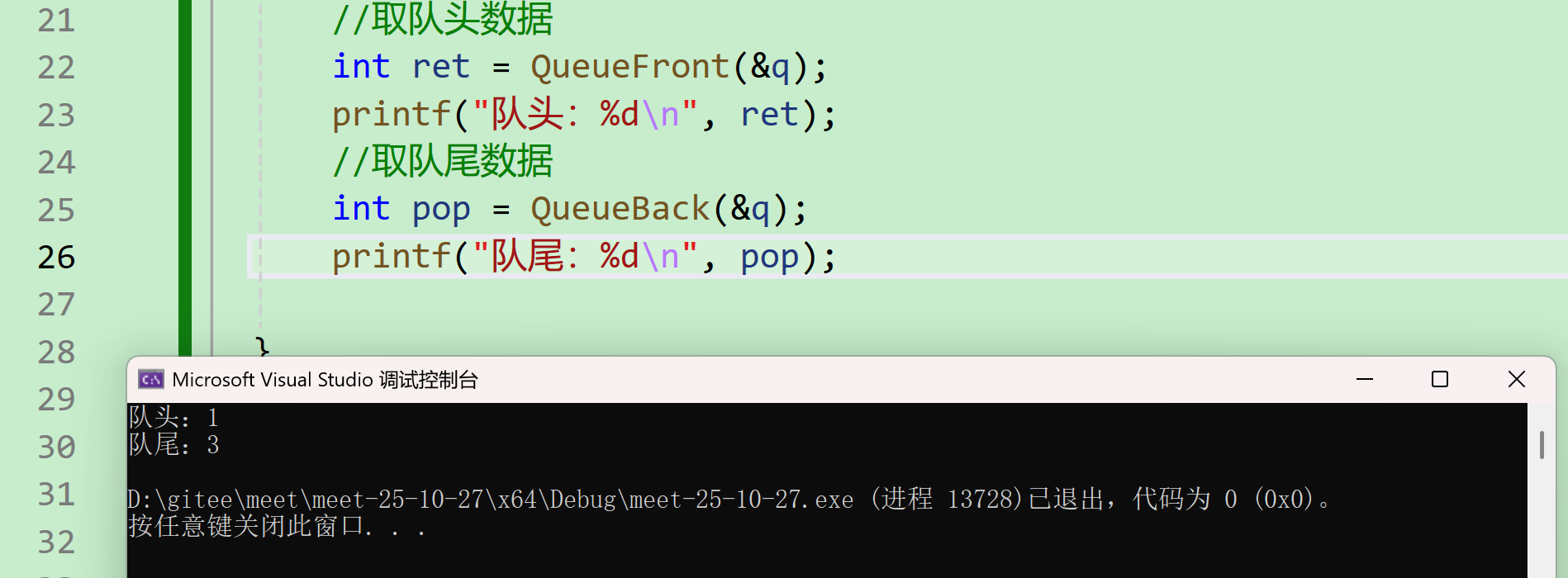 {Queue q;//初始化QueueInit(&q);//入队列--队尾QueuePush(&q, 1);QueuePush(&q, 2);QueuePush(&q, 3);////出队列--队头//QueuePop(&q);//QueuePop(&q);//QueuePop(&q);////取队头数据//int ret = QueueFront(&q);//printf("队头:%d\n", ret);////取队尾数据//int pop = QueueBack(&q);//printf("队尾:%d\n", pop);//队列有效元素个数/*printf("%d\n", QueueSize(&q));*///销毁QueueDestroy(&q);}int main()