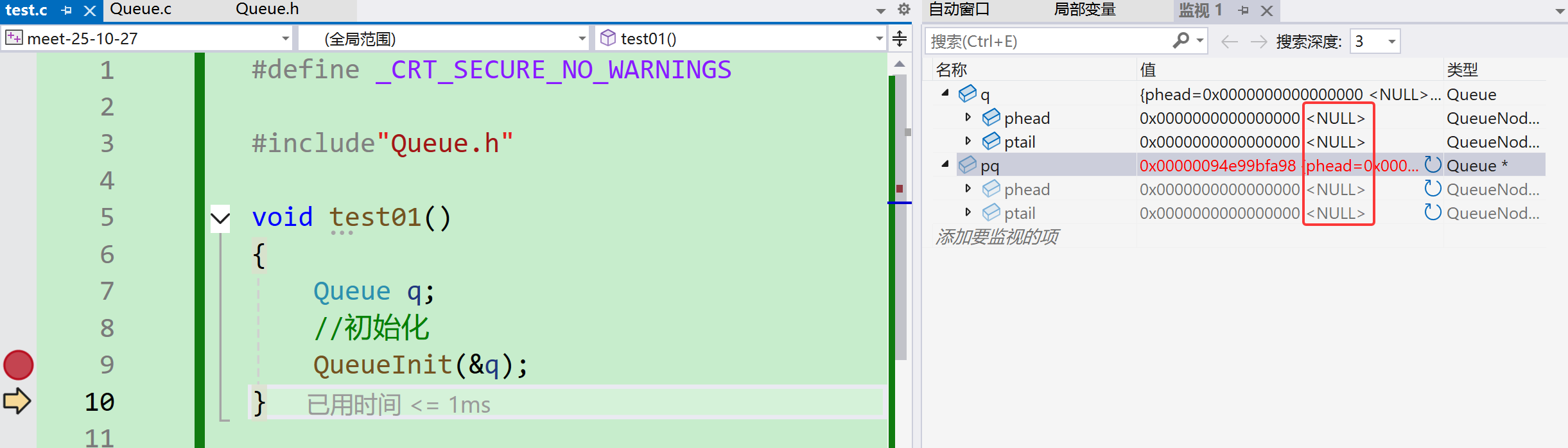 判断队列是否为空,这里传队列的时候pq不能为空则找到队列。如果队列为空时,则对头为NULL。