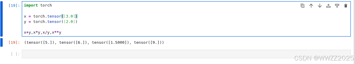 import torchx = torch.tensor([3.0]) y = torch.tensor([2.0])x+y,x*y,x/y,x**y